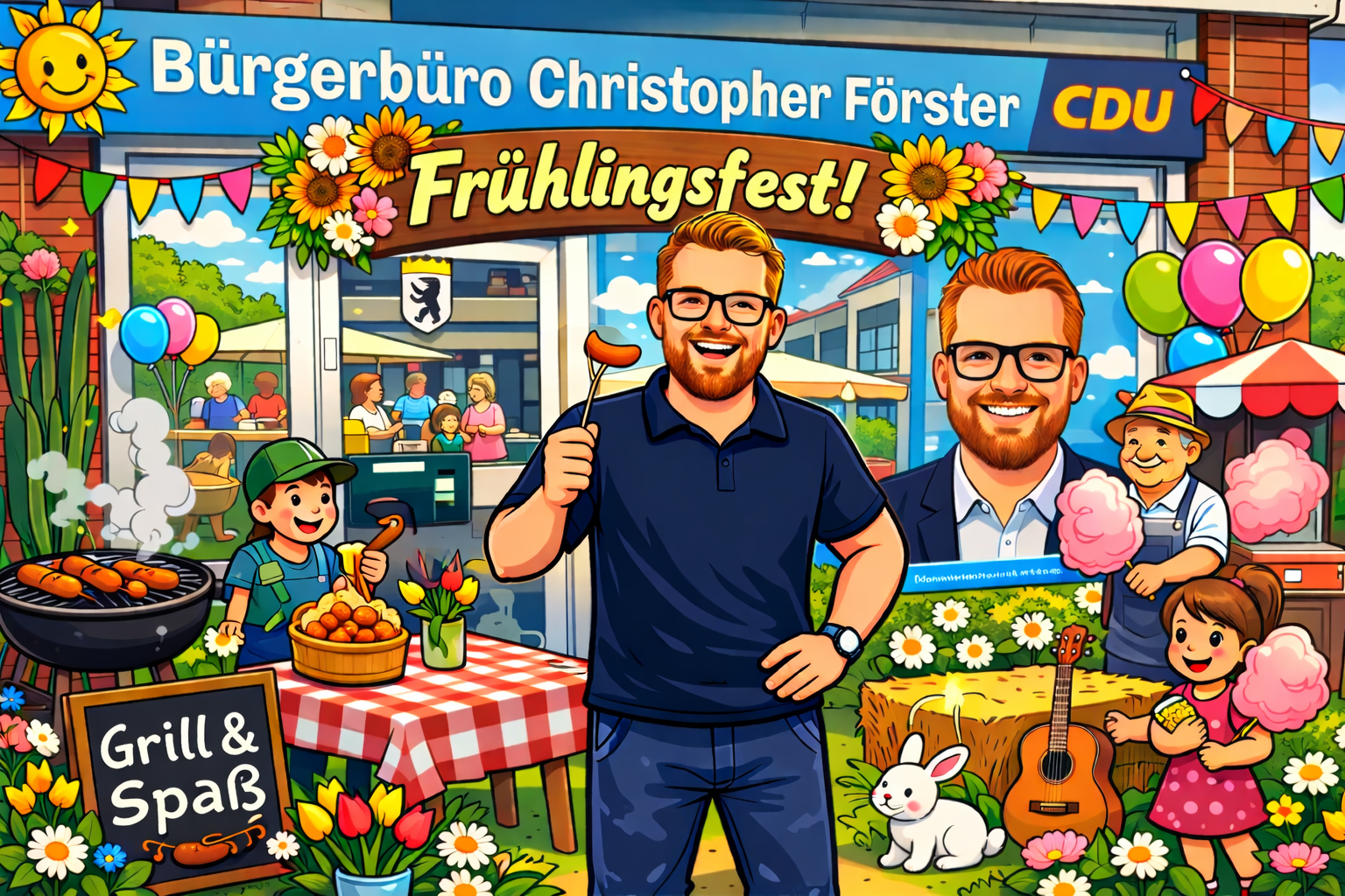 12 Februar, 2026 Karsten Schulze Frühlingsfest 1 1 people viewed this event. Für Veranstaltung registrieren Um dich für diese Veranstaltung zu registrieren, sende deine Daten an buero@christopher-foerster.de Registriere Dich über Webmail: Gmail / AOL / Yahoo / Outlook Datum und Uhrzeit 20.03.2026 | 15:00 Ort Bürgerbüro, Lipschitzallee 69, 12353 Veranstaltungsarten Grill den Förster Share With Friends Facebook Twitter LinkedIn Xing Pinterest